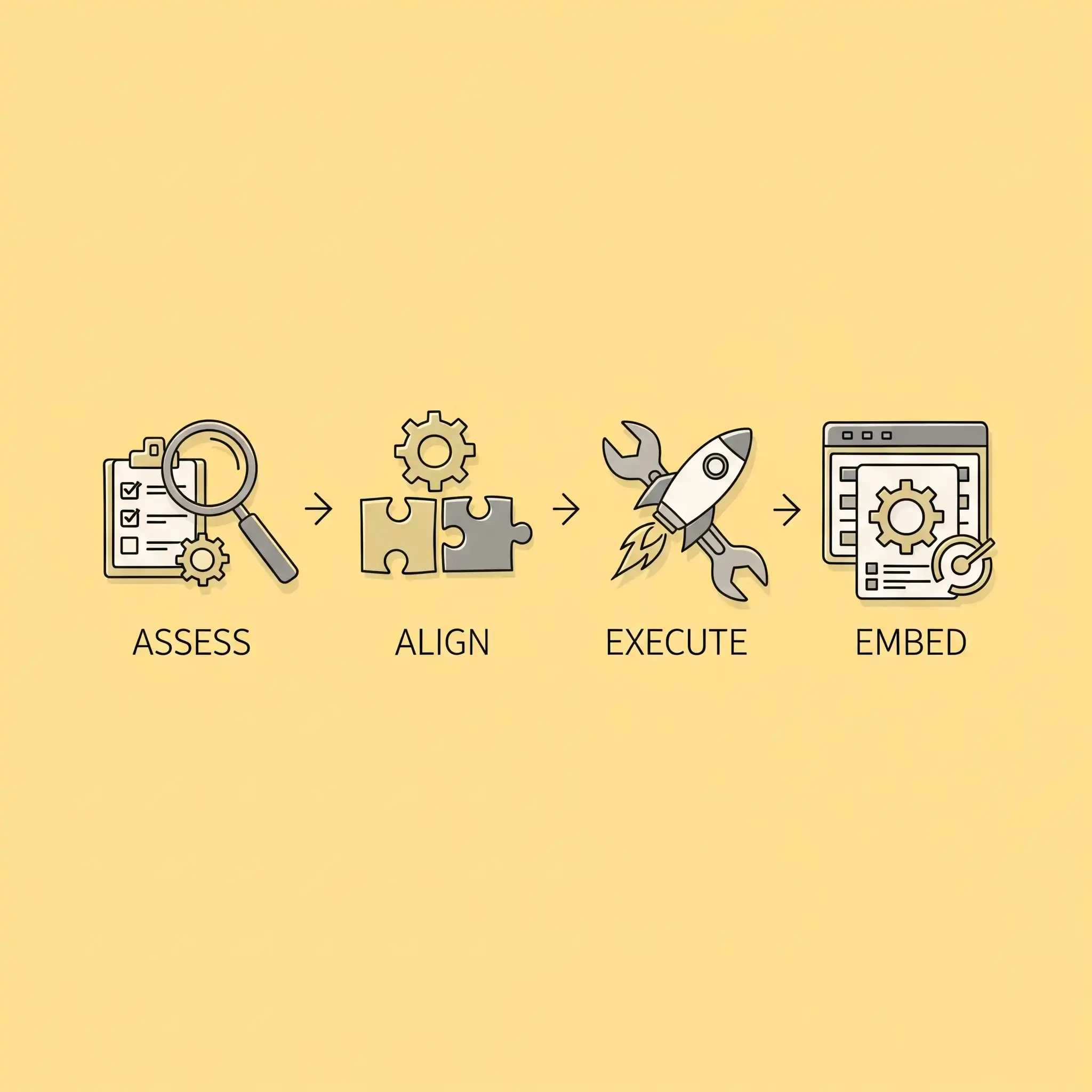 map → fix → lock; approvals, checklists, and dashboards people use.